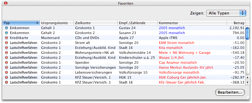 Sie können sehen, welche Transaktionen aufgezeichnet wurden, wenn Sie das Favoriten-Fenster öffnen (wählen Sie den Menüpunkt 'Favoriten' entweder im Kontextmenü oder im Transaktionsmenü aus). Mit Hilfe des Aufklappmenüs in der oberen rechten Ecke können Sie bestimmen, ob die Liste alle oder nur bestimmte Transaktionstypen anzeigen soll. Um eine Transaktion zu verwenden, wählen Sie sie aus der Liste aus und klicken Sie auf 'Auswählen' oder doppelklicken Sie sie einfach auf der Liste. Das Fenster wird dann geschlossen und der Favoriteneintrag wird in die Transaktions-Eingabefelder kopiert.