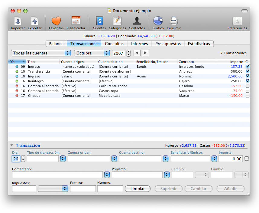Grabar transacciones: iCash le permite grabar a los favoritos las transacciones que use con frecuencia. Es tan fácil como seleccionar una transacción, hacer control + click (o click derecho del ratón) para mostrar el menú contextual. Seleccione entonces "Añadir a los favoritos" para que su transacción se añada automáticamente. También puede hacerlo desde el menú "Transacción - Añadir a los favoritos".