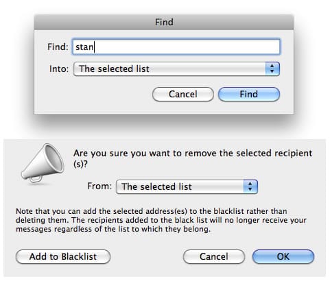 This is a very popular request. We have added the possibility to both search and delete recipients from several or all lists at once. To delete a recipient from all your local lists just proceed as usual. You will just found out that the confirmation window has been modified and allows you to select whether you want to remove the address(es) from the local list or from all lists. The same happens for searching, the search window now lets you select where to search, the selected list, a given local list or all lists. Searching in the selected list works as usual. Searching in the other lists will display a new window with the results grouped per list. Double-clicking a line will take you to the entry in the list it belongs.