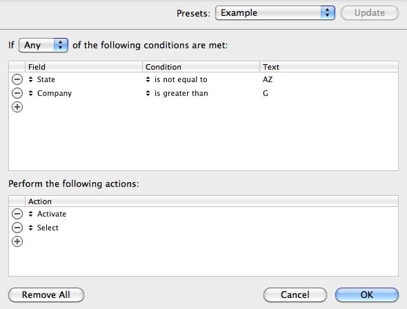The Quick Selector was introduced in december 2004 as a very simple way to get recipients activated or selected depending on a given criteria. It was great but as said, it only allowed to select one action and one single criteria at once. We decided to maintain that 2004 Quick Selector as it may be enough on many situations but we have added a new one, and the new one lets you set as many criteria and actions as you need with no limits! For example this feature is perfect for creating a complex selection in order to send a message to a set of recipients, first you use the Quick Selector to create your selection and once done you just need to use the 'Delivery > Send To Selection' menu. The new Quick Selector is available from the recipients 'Tool' button and the new '…' button on old Quick Selector.