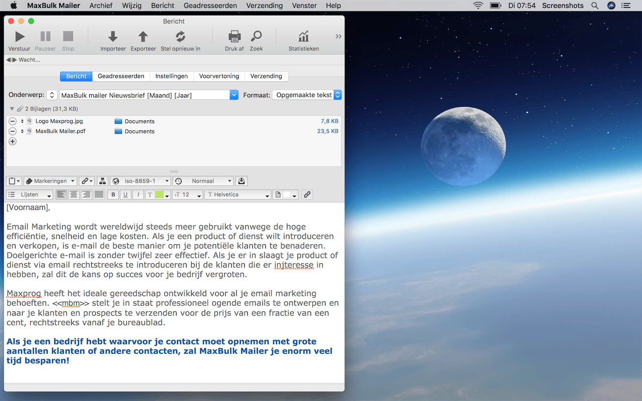 MaxBulk Mailer is a full-featured and easy-to-use bulk mailer and mail-merge software for macOS and Windows that allows you to send out customized press releases, prices lists, newsletters and any kind of text or HTML documents to your customers or contacts.